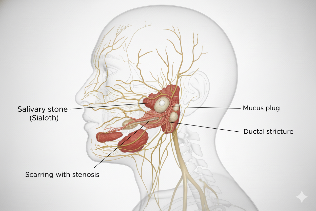 Saliva travels from these glands into the mouth through narrow ducts. When blockages occur, normal flow is disrupted, leading to discomfort and potential complications.